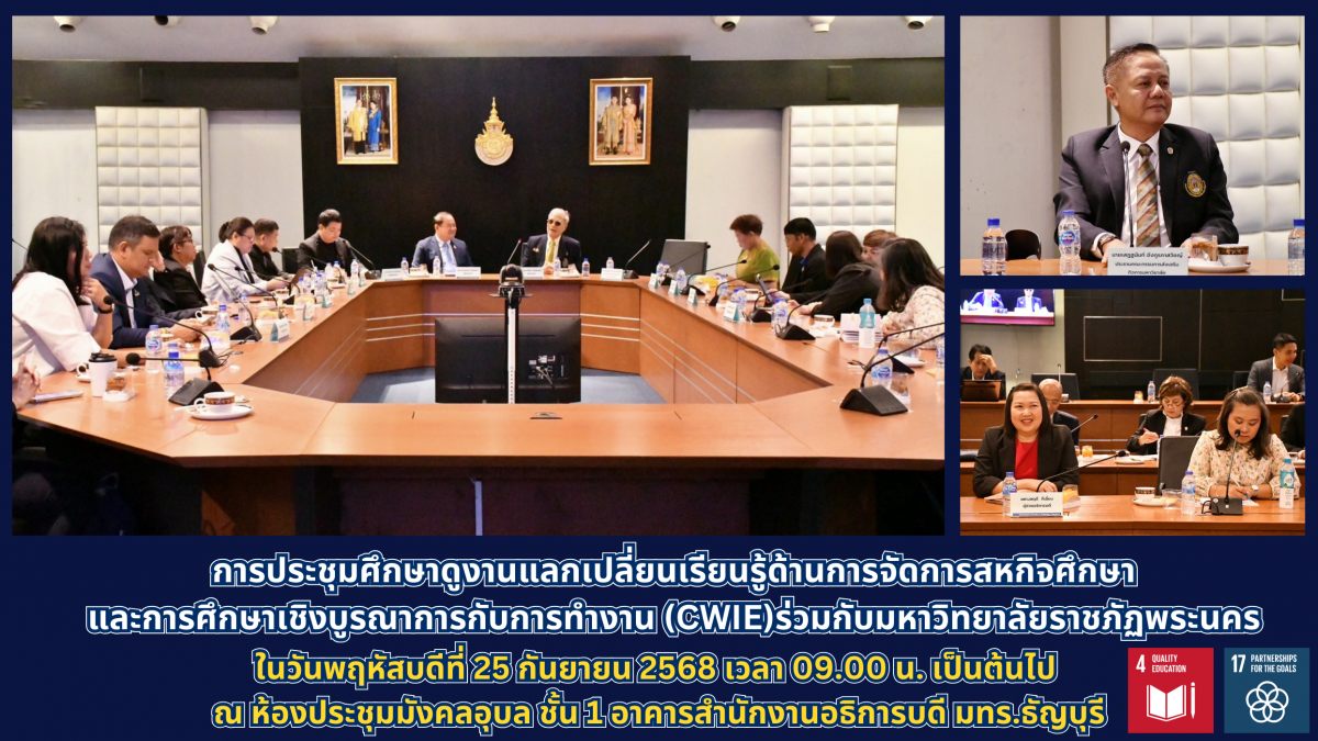 กันยายน 30, 2025รองศาสตราจารย์ ดร.สมหมาย ผิวสอาด อธิการบดีมหาวิทยาลัยเทคโนโลยีราชมงคลธัญบุรี ให้เกียรติเป็นประธานต้อนรับ คณะผู้บริหารและบุคลากร จากมหาวิทยาลัยราชภัฏพระนคร ในการประชุมศึกษาดูงานและแลกเปลี่ยนเรียนรู้