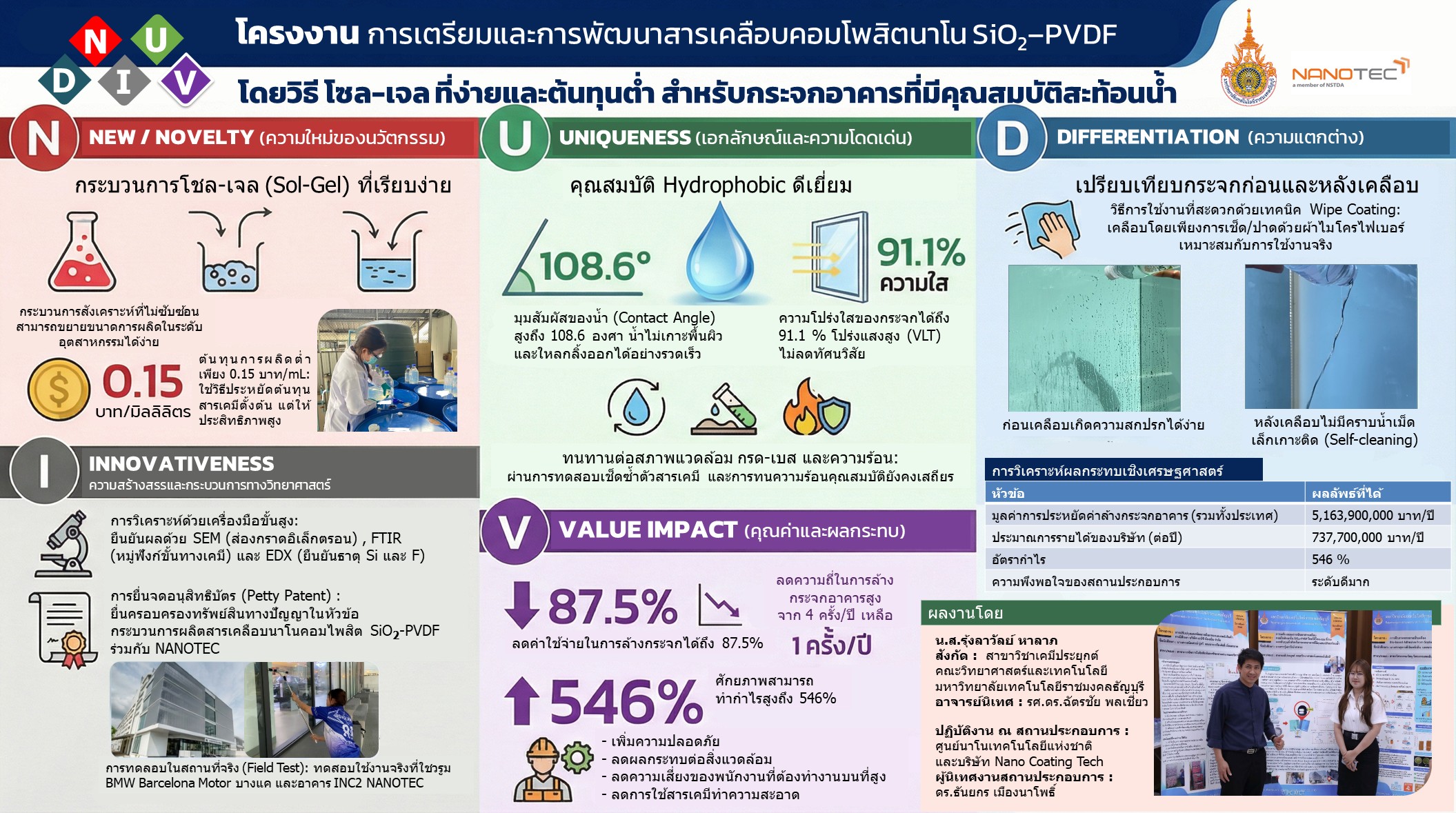 ทีมผู้พัฒนาได้คิดค้น “สารเคลือบคอมโพสิตบนพื้นผิว SiO₂–PVDF ด้วยเทคโนโลยีโซล-เจล” เพื่อเพิ่มคุณสมบัติการไม่ชอบน้ำ (Hydrophobic) ให้กับพื้นผิวกระจก ส่งผลให้น้ำไม่สามารถเกาะตัวได้ง่าย ลดการสะสมของคราบน้ำ ฝุ่น และสิ่งสกปรกต่าง ๆ โดยการทดสอบพบว่าสารเคลือบมีมุมสัมผัสน้ำสูงถึง 108.6 องศา ซึ่งถือเป็นระดับที่แสดงถึงประสิทธิภาพในการไล่น้ำได้ดี นอกจากนี้ยังช่วยลดการเกาะของฝุ่นบนพื้นผิวกระจกได้ถึง 91.1% ทำให้กระจกสะอาดใสได้นานขึ้น
