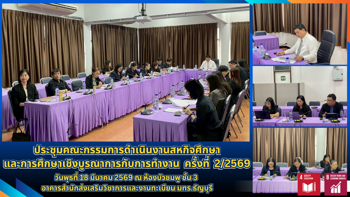มีนาคม 12, 2026ศาสตราจารย์ ดร.กฤษณ์ชนม์ ภูมิกิตติพิชญ์ รองอธิการบดี มหาวิทยาลัยเทคโนโลยีราชมงคลธัญบุรี เป็นประธานในการประชุมคณะกรรมการดำเนินงานสหกิจศึกษาและการศึกษาเชิงบูรณาการกับการทำงาน มทร.ธัญบุรี ครั้งที่ 2/2569 โดยมีคณะกรรมการดำเนินงานเข้าร่วมประชุมอย่างพร้อมเพรียง