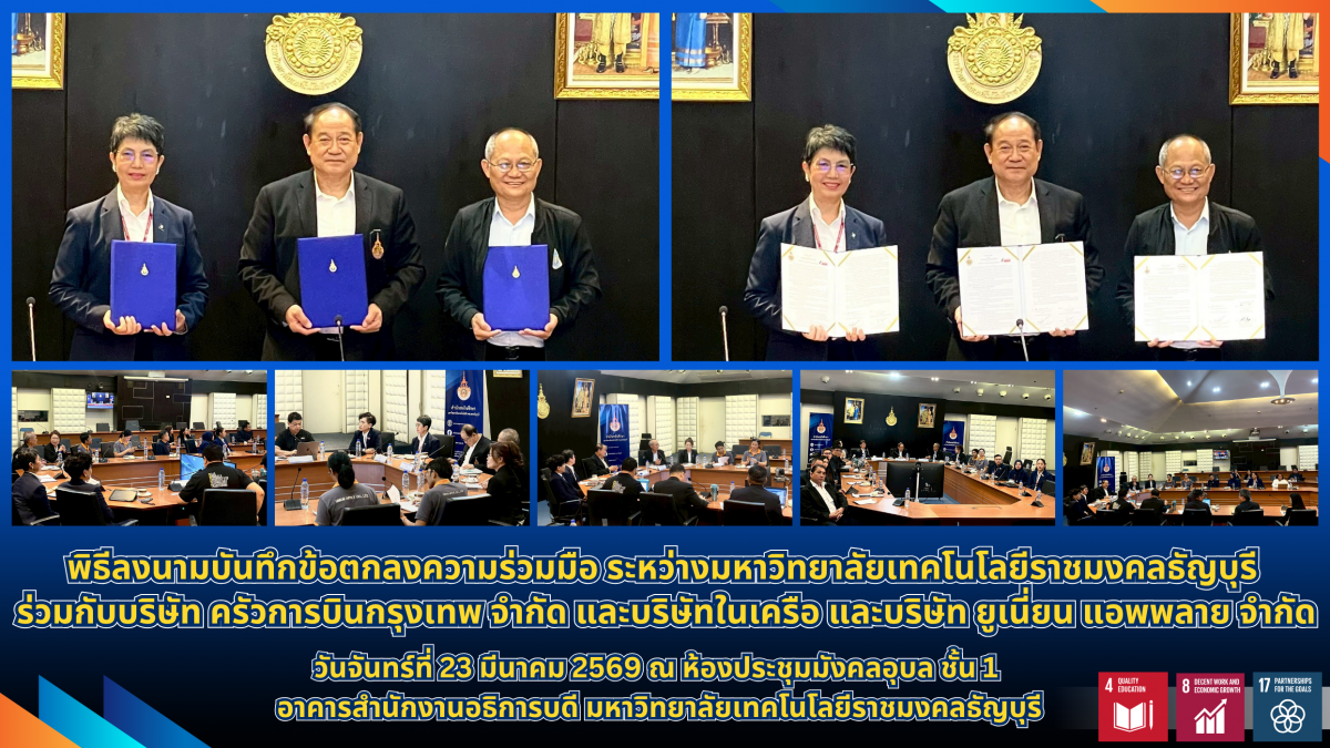 พิธีลงนามจัดขึ้นเมื่อวันจันทร์ที่ 23 มีนาคม 2569 ณ ห้องประชุมมังคลอุบล ชั้น 1 อาคารสำนักงานอธิการบดี มหาวิทยาลัยเทคโนโลยีราชมงคลธัญบุรี