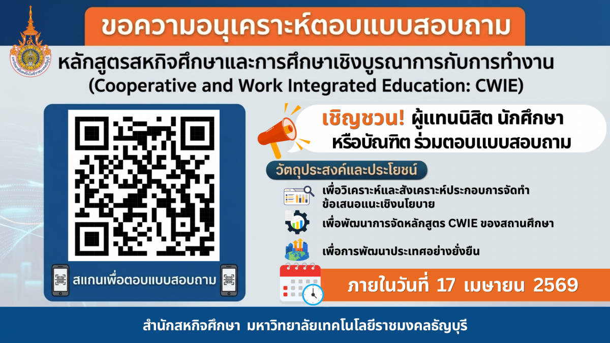 เมษายน 4, 2026มหาวิทยาลัยขอความร่วมมือนิสิต นักศึกษา และบัณฑิต ร่วมตอบแบบสอบถามเกี่ยวกับการจัดหลักสูตรสหกิจศึกษาและการศึกษาเชิงบูรณาการกับการทำงาน (Cooperative and Work Integrated Education: CWIE)
