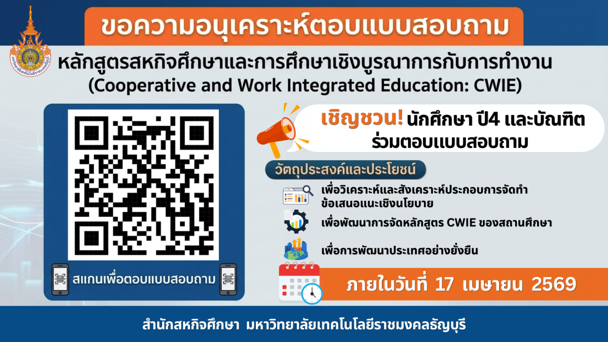เมษายน 4, 2026มหาวิทยาลัยขอความร่วมมือนิสิต นักศึกษา และบัณฑิต ร่วมตอบแบบสอบถามเกี่ยวกับการจัดหลักสูตรสหกิจศึกษาและการศึกษาเชิงบูรณาการกับการทำงาน (Cooperative and Work Integrated Education: CWIE)